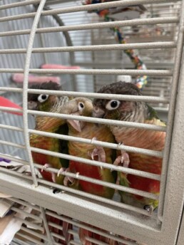 These three green cheek conures are the very best of friends and would love to bring triple the feathered fun to your family. Green cheek conures are very popular for their small size matched with high intelligence and big personality. We would love for this trio of best friends to get to be adopted together.